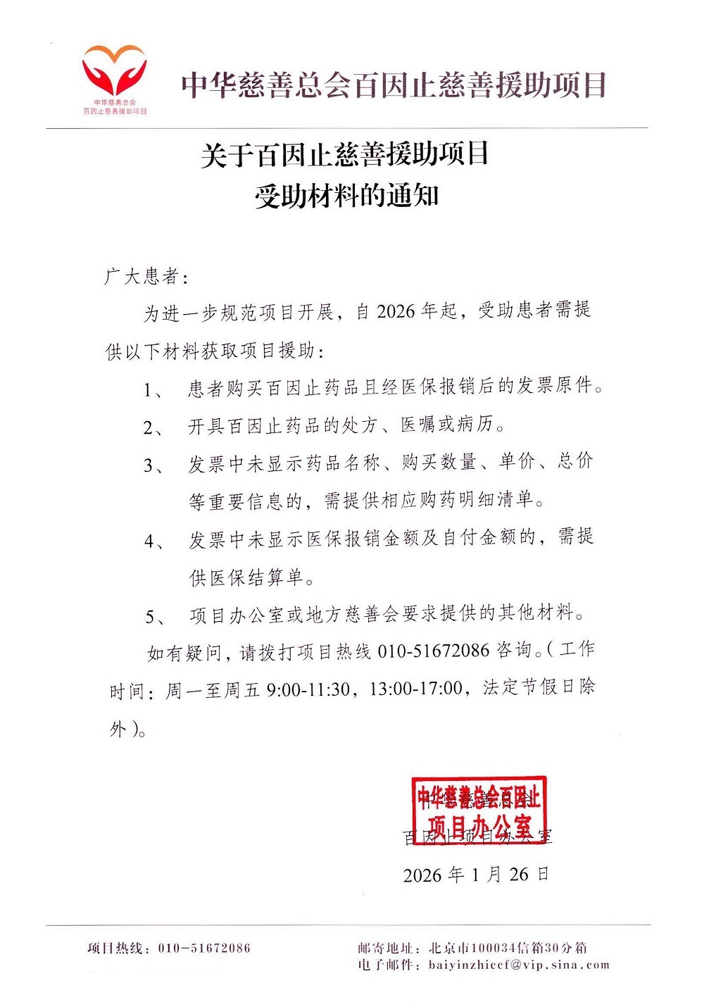 关于百因止慈善援助项目受助材料的通知